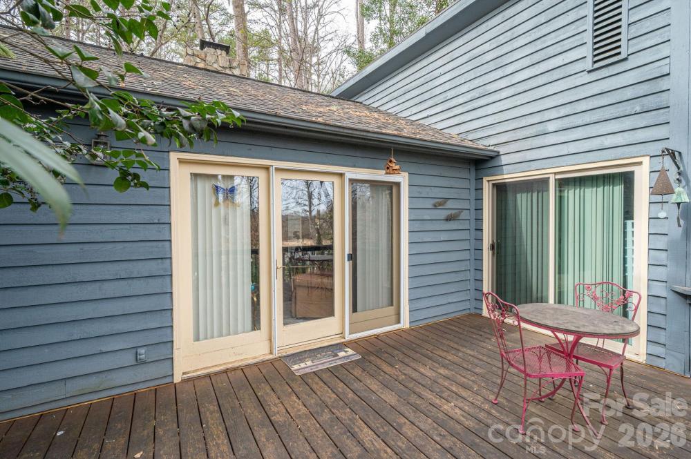 One level home with no interior steps and ramp to the front door. Convenient to restaurants and shopping. Living room with fireplace, built-ins and sliding glass door out to a large deck at overlooks a beautiful wooded yard and neighboring pond. The dining room offers a bay window that is perfect for plants. The full bathroom offers a walk-in tub. Large primary bedroom with picture window with a great view and sliding door to the deck. Easy to maintain luxury vinyl plank floors throughout the home and a tankless water heater. Low HOA ($90 a quarter) covers street lights, street maintenance and lawn care.