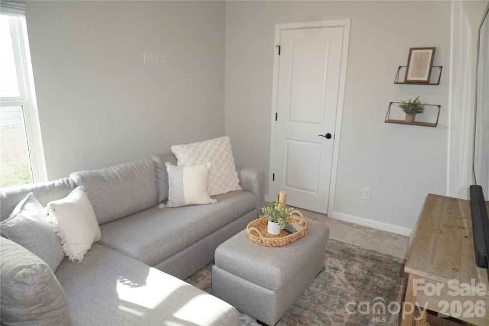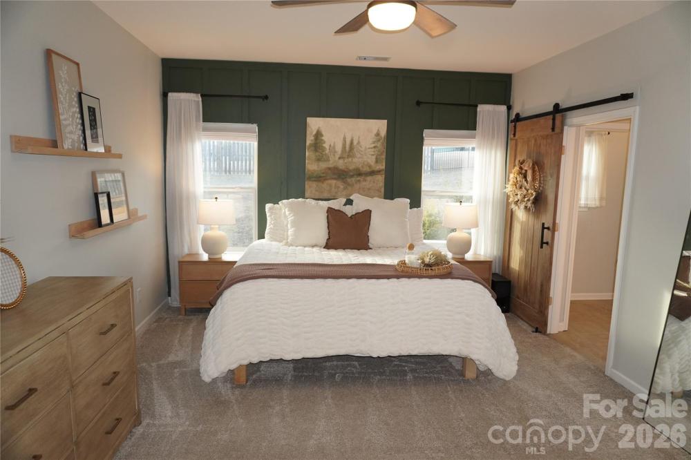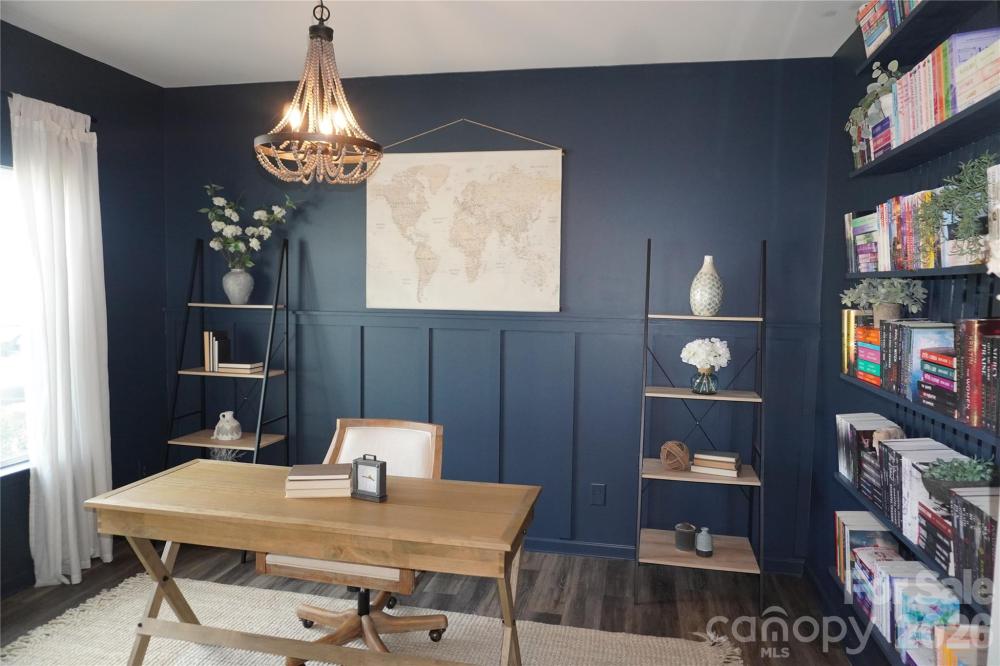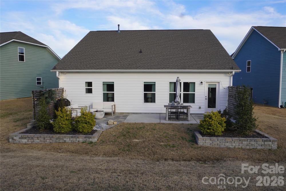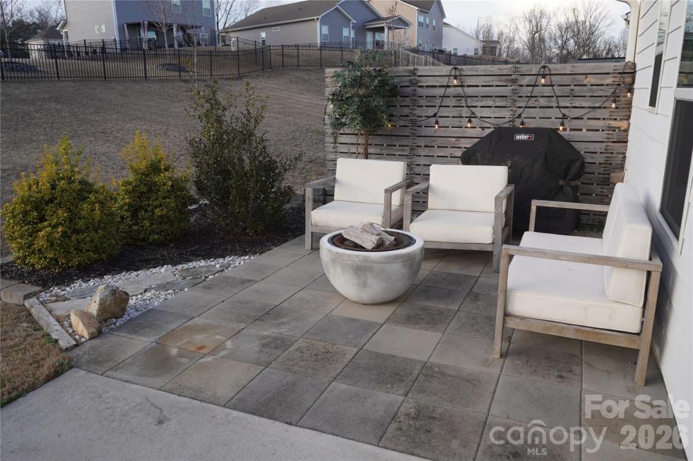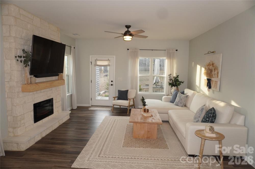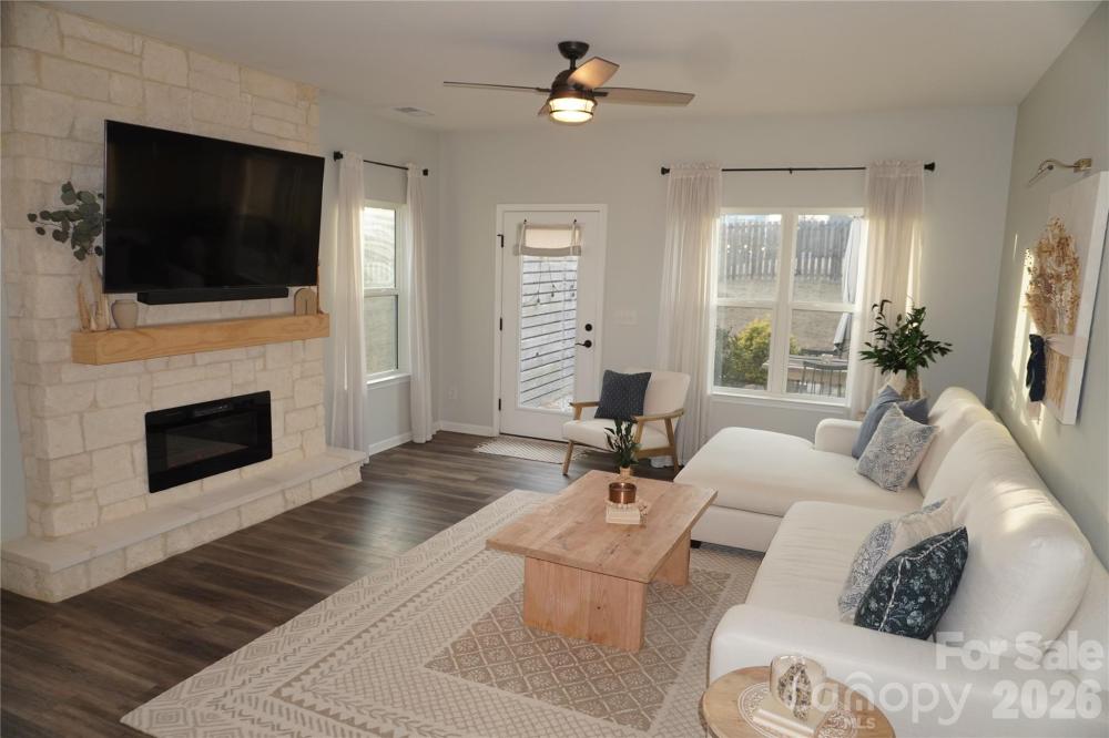 Beautifully updated 3-bedroom, 2-bath ranch in highly sought-after River Park community, thoughtfully elevated far beyond the builder’s basic finishes. Upon entry, you’re welcomed into a completely open floor plan highlighting a chef’s kitchen featuring white shaker cabinetry, quartz countertops, tile backsplash, stainless steel appliances, and an oversized island perfect for gathering and entertaining. The dining area flows seamlessly into the living room, where a designer electric fireplace with custom wood mantle & Eldorado stone surround creates a warm focal point, adding so much character. Behind french doors, the dedicated home office offers the perfect work-from-home setup and has been beautifully upgraded with custom trim work, a built-in bookshelf, and a rich, color-drenched navy finish that gives the room a moody feel. The primary suite features a forest green trim accent wall and custom walk-in closet with built-ins. A sliding barn door leads to the ensuite bath, complete with a walk-in tile shower with bench, double-sink vanity, and elevated design finishes. A split floor plan offers additional privacy, with the secondary bedrooms and full bath tucked away behind dual antique sliding doors off the main living space—adding both function and a unique architectural detail. Spacious laundry room features floating shelves for added storage. Enjoy North Carolina’s beautiful weather year-round in the thoughtfully designed backyard, featuring a concrete pad and extended paver patio with retaining wall and privacy walls, creating the perfect setting for relaxing. Rather than taking on the time and expense of upgrades yourself, enjoy the advantage of a home that is already beautifully updated, on-trend, and completely move-in ready. River Park neighborhood offers fantastic family-friendly amenities, including a community clubhouse, pool, playground, and walking trails. Designed to stand out; this home delivers the style and personality buyers are searching for!