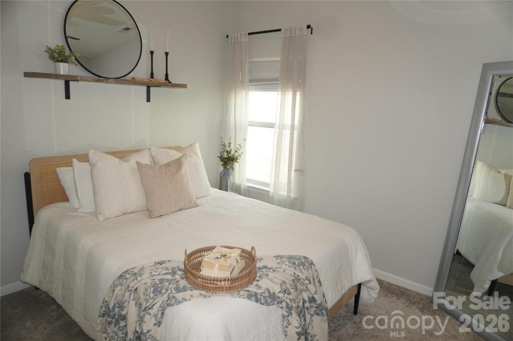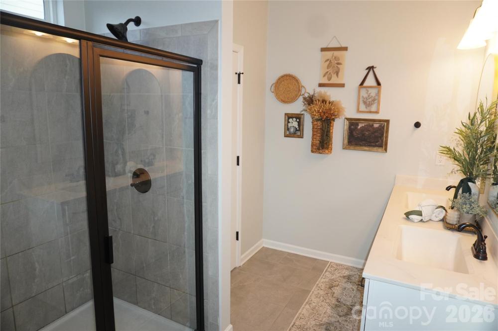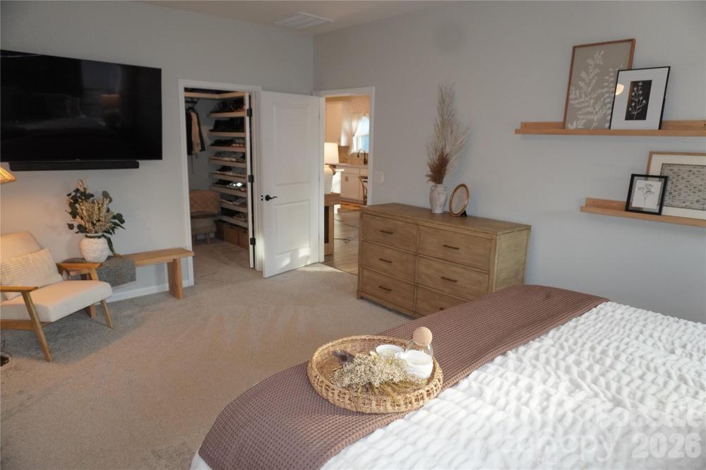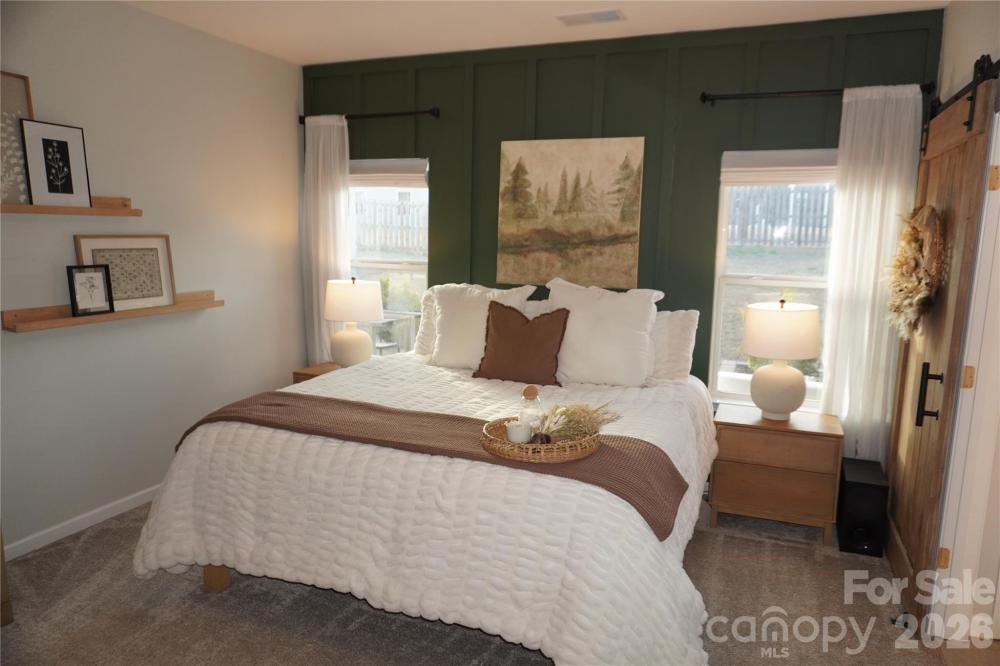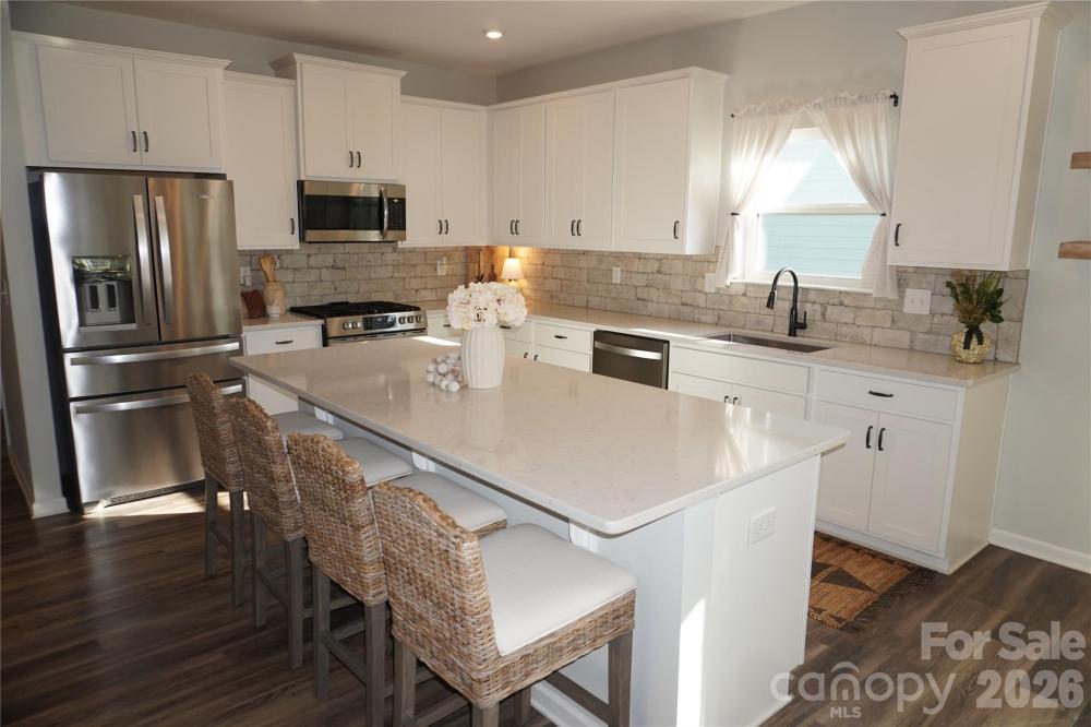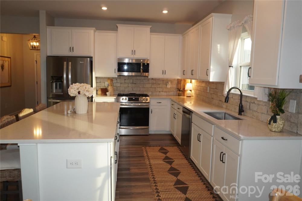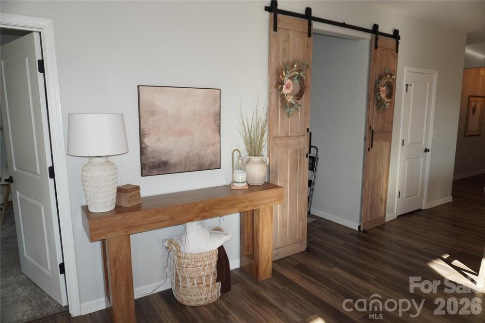 Beautifully updated 3-bedroom, 2-bath ranch in highly sought-after River Park community, thoughtfully elevated far beyond the builder’s basic finishes. Upon entry, you’re welcomed into a completely open floor plan highlighting a chef’s kitchen featuring white shaker cabinetry, quartz countertops, tile backsplash, stainless steel appliances, and an oversized island perfect for gathering and entertaining. The dining area flows seamlessly into the living room, where a designer electric fireplace with custom wood mantle & Eldorado stone surround creates a warm focal point, adding so much character. Behind french doors, the dedicated home office offers the perfect work-from-home setup and has been beautifully upgraded with custom trim work, a built-in bookshelf, and a rich, color-drenched navy finish that gives the room a moody feel. The primary suite features a forest green trim accent wall and custom walk-in closet with built-ins. A sliding barn door leads to the ensuite bath, complete with a walk-in tile shower with bench, double-sink vanity, and elevated design finishes. A split floor plan offers additional privacy, with the secondary bedrooms and full bath tucked away behind dual antique sliding doors off the main living space—adding both function and a unique architectural detail. Spacious laundry room features floating shelves for added storage. Enjoy North Carolina’s beautiful weather year-round in the thoughtfully designed backyard, featuring a concrete pad and extended paver patio with retaining wall and privacy walls, creating the perfect setting for relaxing. Rather than taking on the time and expense of upgrades yourself, enjoy the advantage of a home that is already beautifully updated, on-trend, and completely move-in ready. River Park neighborhood offers fantastic family-friendly amenities, including a community clubhouse, pool, playground, and walking trails. Designed to stand out; this home delivers the style and personality buyers are searching for!