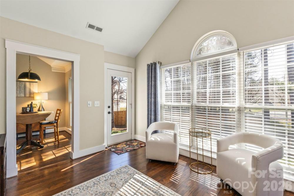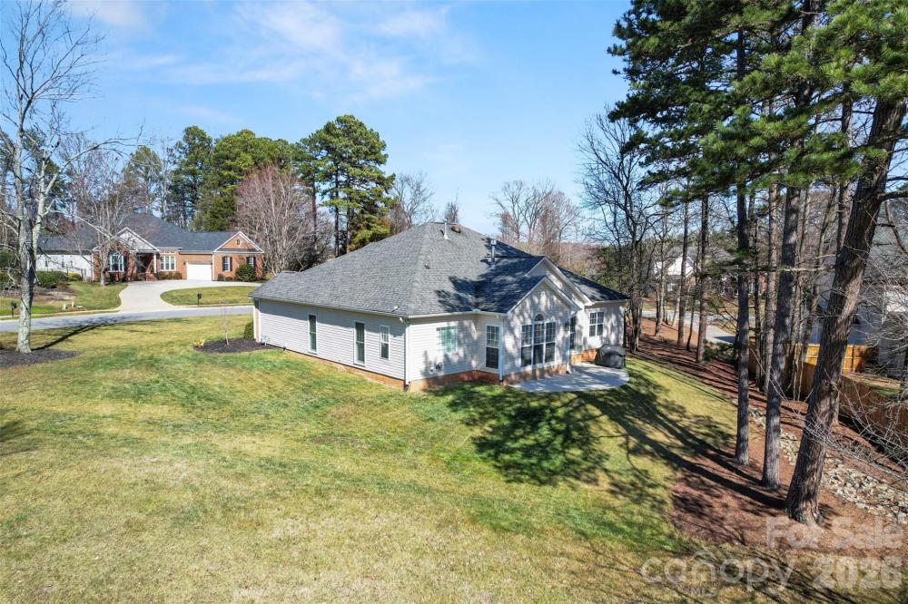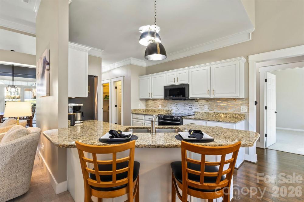 Meticulously maintained partial-brick ranch in The Gates at Waterside. Originally the Niblock model home, this property continues to show like a brand-new designer space. The open-concept interior is anchored by an impressive 12-foot ceiling in the main living area and a sophisticated see-through gas fireplace, creating a grand sense of scale and warmth throughout the heart of the home. The primary suite features an elegant tray ceiling, while secondary rooms offer airy vaults. The well-appointed kitchen boasts solid granite countertops, a breakfast bar, and sleek black Samsung stainless appliances. Experience modern convenience with full smart-home integration: the HVAC, irrigation, and the original multi-zone 5-room audio system are all app-controlled via your smart device. Positioned on a large corner lot, the property abuts HOA-managed green space, providing a sprawling, private feel. Enjoy community amenities including a pool and playground in a prime location—A stones throw from local dining and shopping. This home is perfectly situated 10 minutes from Lake Norman marinas, 15 minutes to Birkdale Village, and 20 minutes to both Uptown Charlotte and Charlotte Douglas International Airport. Agent owned.